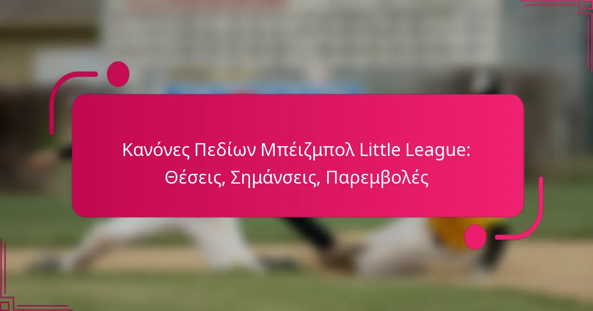 Στο μπέιζμπολ της Little League, η κατανόηση των κανόνων πεδίου είναι ουσιώδης για την αποτελεσματική διεξαγωγή του παιχνιδιού. Κύριες θέσεις όπως ο ρίπτης, ο υποδοχέας, οι εσωτερικοί παίκτες και οι εξωτερικοί παίκτες έχουν συγκεκριμένες ευθύνες που συμβάλλουν στην άμυνα της ομάδας. Επιπλέον, η εκμάθηση τεχνικών σήμανσης και η αναγνώριση παρεμβολών μπορεί να επηρεάσει σημαντικά την έκβαση ενός παιχνιδιού, εξασφαλίζοντας δίκαιο παιχνίδι και στρατηγικό πλεονέκτημα.