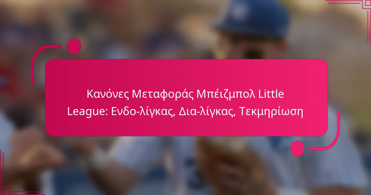 Οι κανόνες μεταφοράς του baseball της Little League καθορίζουν τις διαδικασίες για τους παίκτες που μετακινούνται μεταξύ ομάδων εντός της ίδιας λίγκας ή μεταξύ διαφορετικών λιγκών. Η εξοικείωση με αυτούς τους κανόνες είναι απαραίτητη για την εξασφάλιση συμμόρφωσης και την διευκόλυνση ομαλών μεταβάσεων για τους νεαρούς αθλητές, καθώς κάθε τύπος μεταφοράς έχει ξεχωριστά βήματα και απαιτήσεις τεκμηρίωσης που πρέπει να τηρούνται.